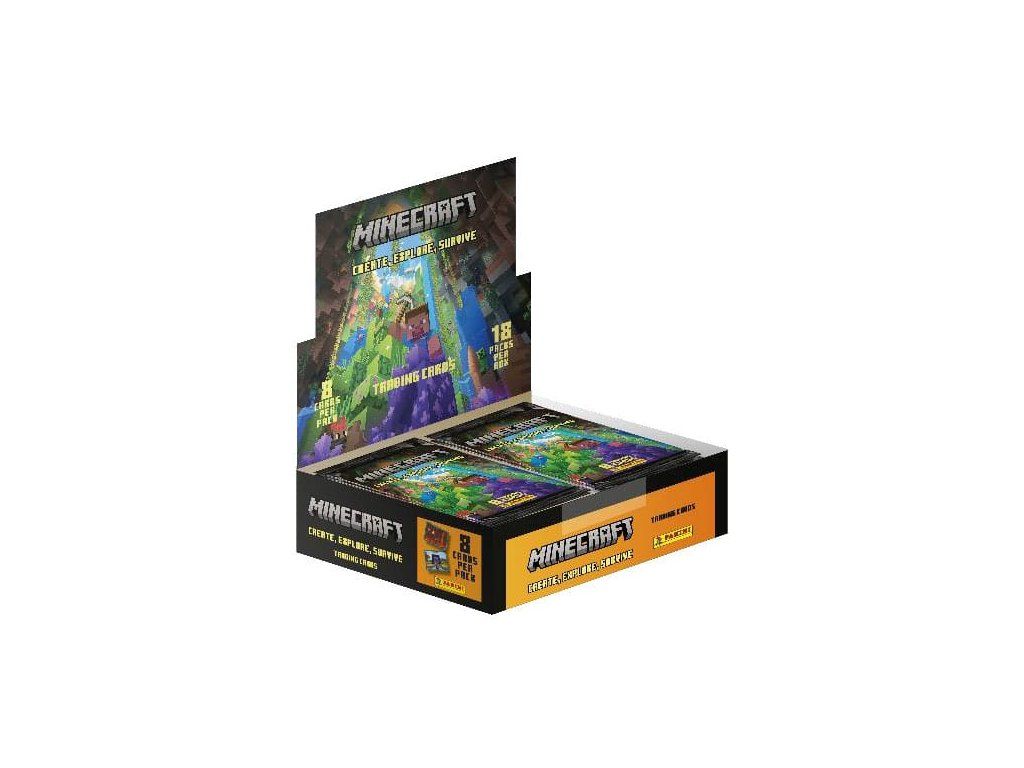 Oficiální Minecraft – Create, Explore, Survive display box obsahující 18 flow packů po 8 kartách. Ideální pro sběratele i fanoušky Minecraftu.