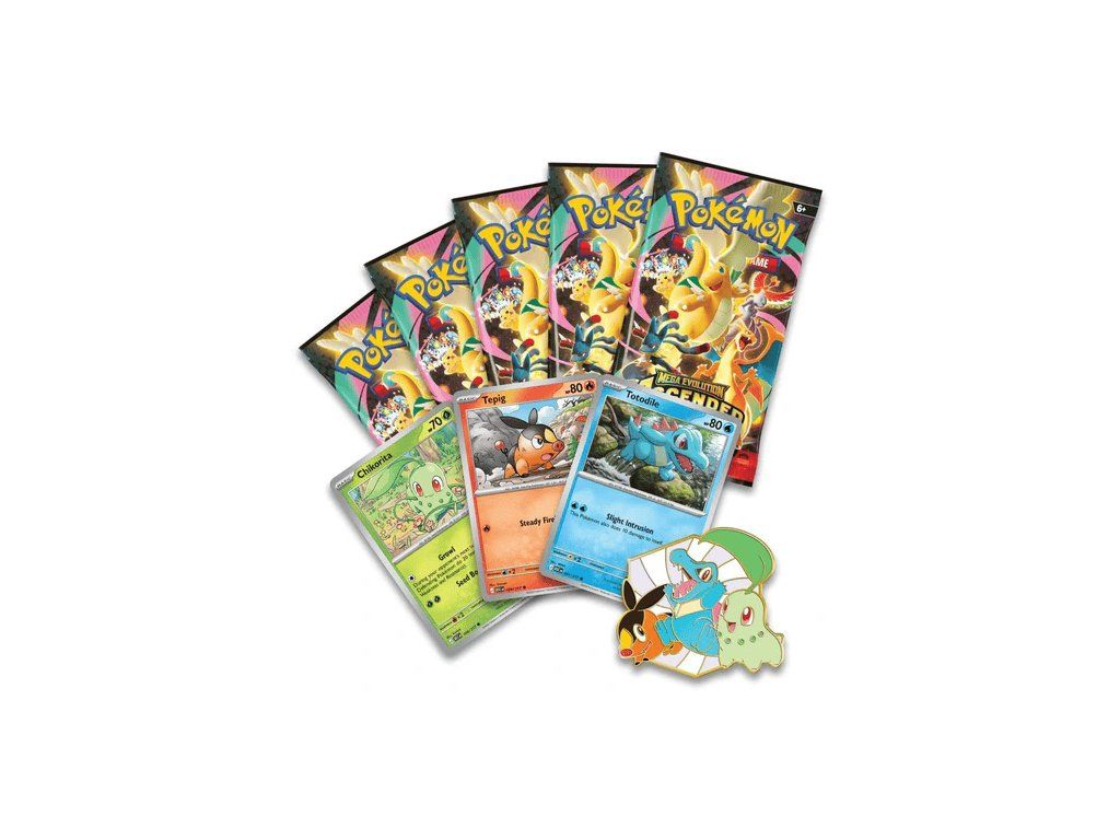 Každá Pokémon cesta začíná volbou svého prvního parťáka — a tahle kolekce ti přináší hned tři ikonické startery v jednom balení. Chikorita, Tepig a Totodile se zde představují jako foilové promo karty, doplněné o luxusní kovový pin, který zobrazuje všechny tři Pokémony společně v lesklém smaltu.