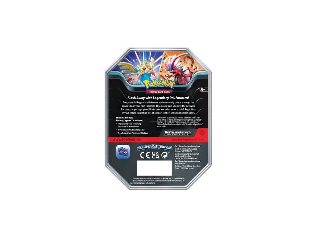 Pokémon TCG: Slashing Legends Ex Tin je ideální volbou pro hráče i sběratele, kteří chtějí rozšířit svou kolekci o nové karty a získat jednu ze silných promo karet. Každá Tin obsahuje foilovou promo kartu Zacian ex nebo Koraidon ex, takže už samotné balení má vysokou sběratelskou hodnotu.