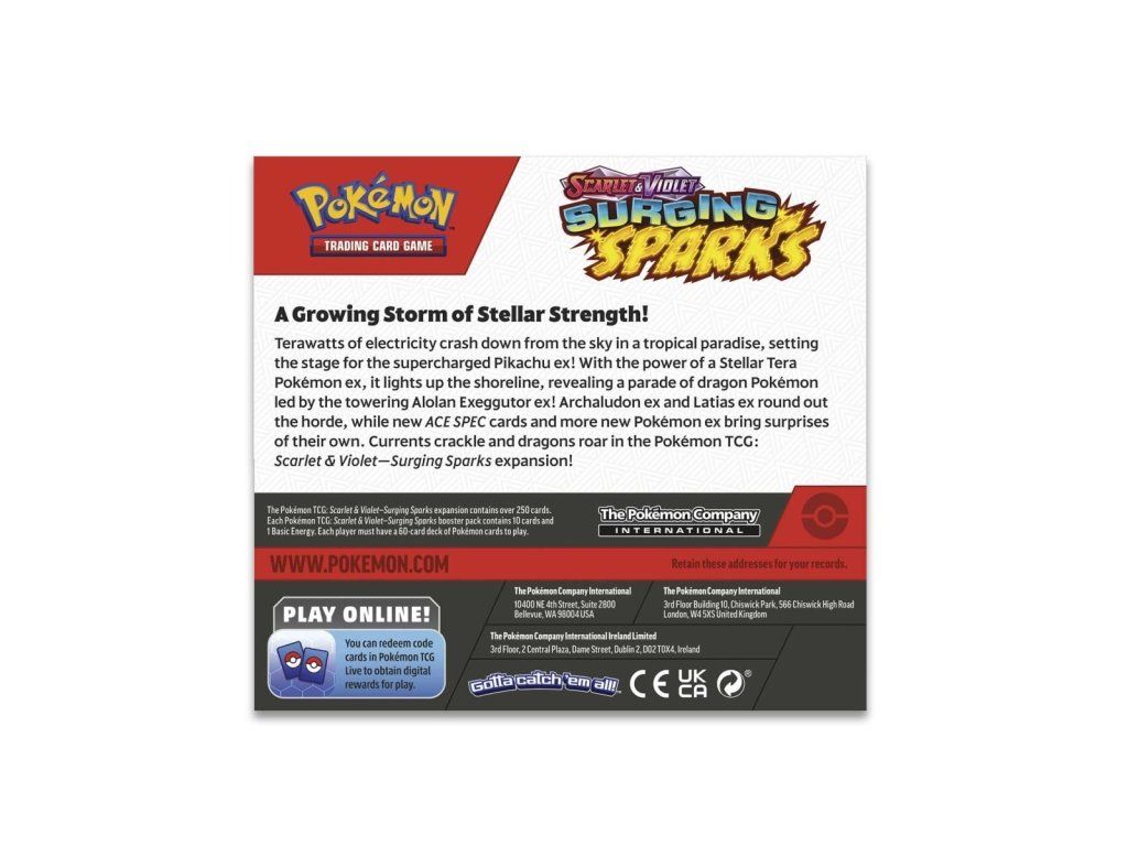 ⚡🐉 Když se blesky střetnou s dračí silou – teď ve velkém balení! V edici Surging Sparks se na scénu řítí elektrizující Pikachu ex jako Stellar Tera Pokémon ex, doprovázený majestátním Alolan Exeggutor ex. Přidávají se i mocní Archaludon ex a Latias ex, zatímco nové ACE SPEC karty přinášejí do hry strategické zvraty, které mohou rozhodnout o vítězství.